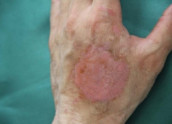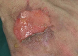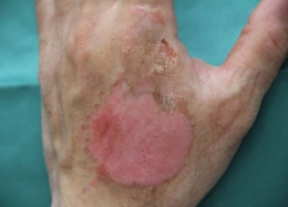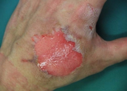 43才 右手背2度熱傷 ■ 2014年11月5日 平成26年4月20日仕事中に油が右手にかかり受傷した。翌日初診となる。 2014年4月21日 初診時 水泡膜を除去後プラスモイストで被覆した。 2014年4月22日 翌日の画像である。 痛みはなく、手仕事を普段どおり可能であった。 2014年4月28日 1週間足らずで上皮化が急速に進行してきた。 2014年4月28日 上皮化が完了した。