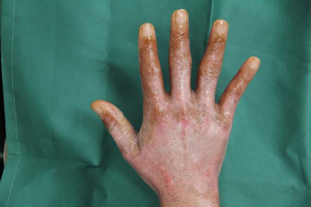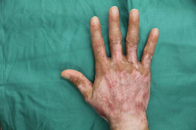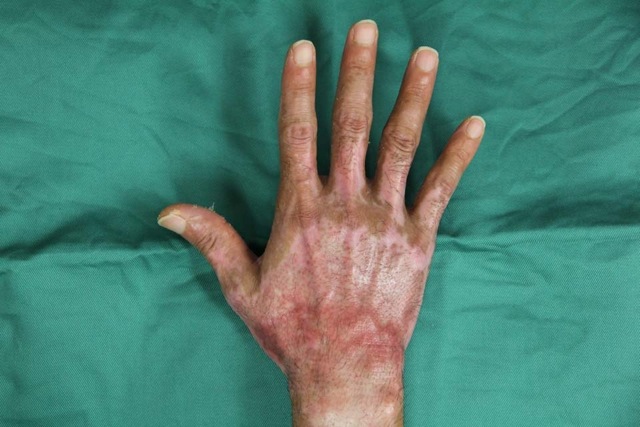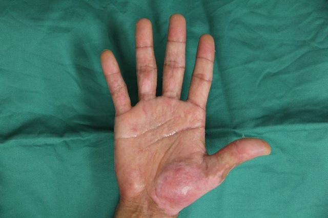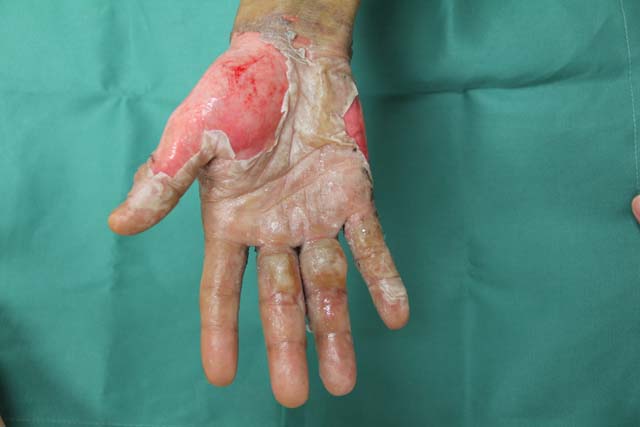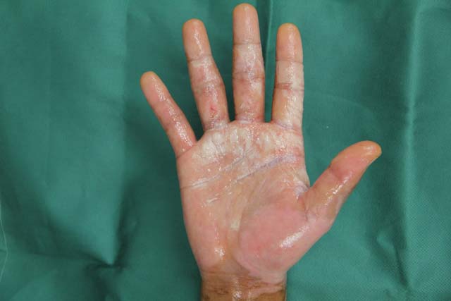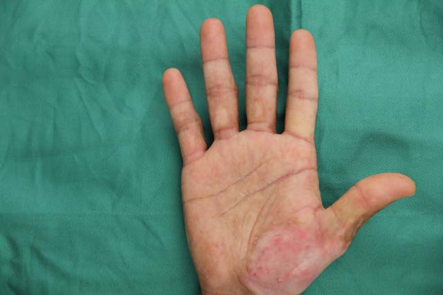 右手掌 母指球部を除きほぼ上皮化してきた状態である。