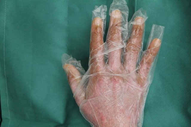 10月29日シンナー使用中に火が飛び火傷した。すぐに某大学病院形成外科受診し、軟膏処置および皮膚移植の可能性を示唆された。10月31日当クリニック初診となった。2度の熱傷なので皮膚を乾燥から守れば皮膚移植になる事はないと説明し、ワセリン+ナイロン手袋処置を施行した。ご自宅では入浴時ナイロン手袋を外し入浴可とし、指をよく動かすように説明をした。