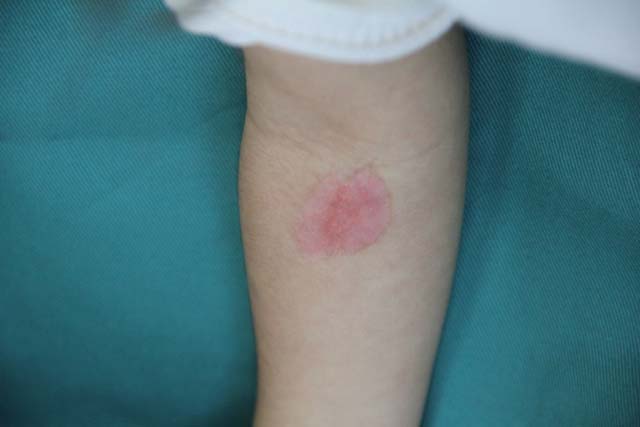 2才1ヶ月女児 右前腕熱傷 ■ 2015年1月22日 8月13日 ヘアアイロンが右腕に当り、近医にてソフラチュール塗布処置を受けていたが、傷の治りを心配したご両親が傷の治り具合が心配になり8月19日当クリニック初診となった。 2014/8/19 熱傷部にはソフラチューツの痕がきっちりと残っていた。 2014/8/28 2014/9/12 治癒した。